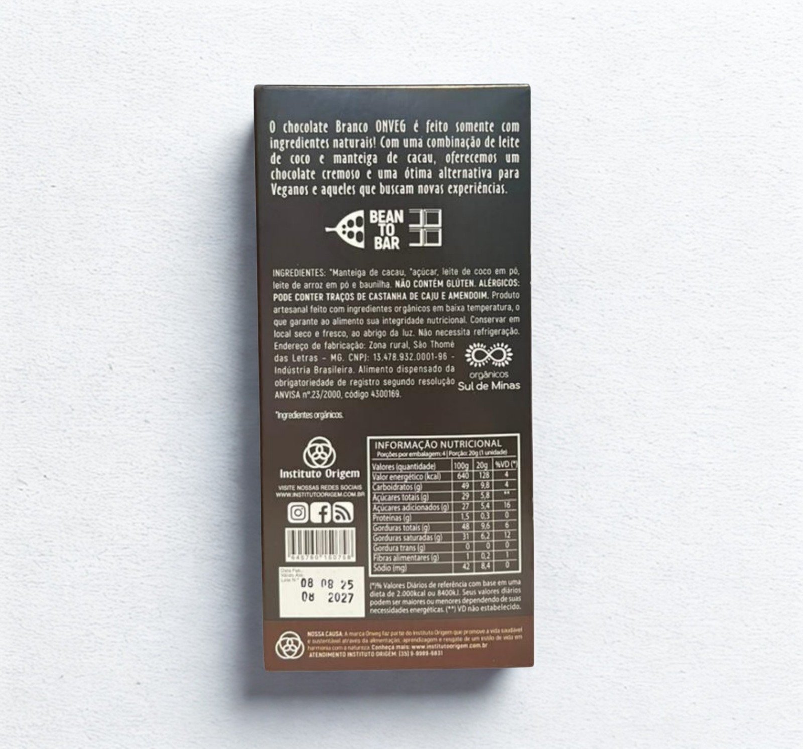 Chocolate Onveg Branco ao Leite de Coco 80g celebra a cremosidade tropical — expressão vegana da manteiga de cacau. Produzido artesanalmente pela Onveg Chocolates em São Thomé das Letras-MG em moinho de pedra com ingredientes 100% naturais e orgânicos, combina leite de coco em pó, manteiga de cacau orgânica, açúcar cristal orgânico e leite de arroz, criando textura macia e notas delicadas para veganos exigentes.