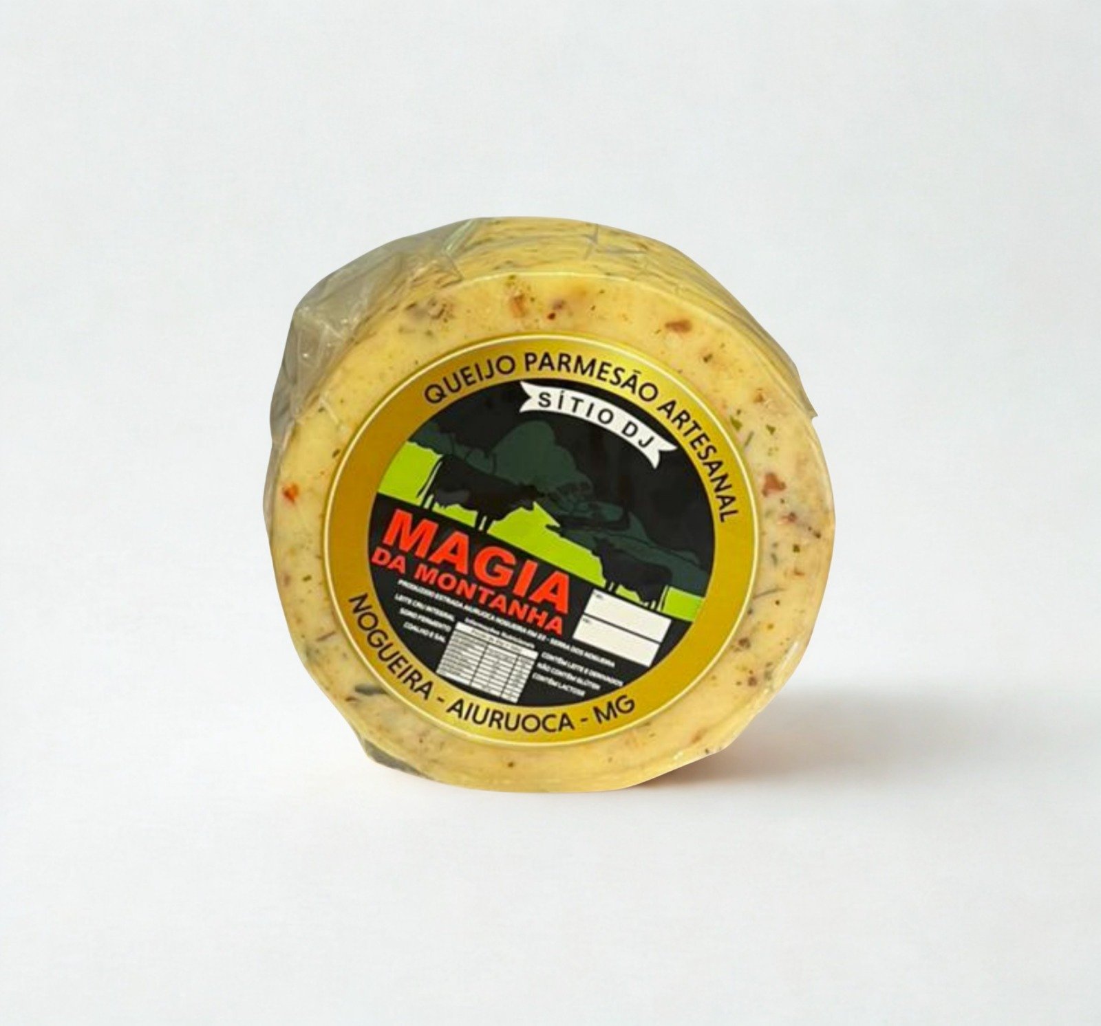 O Queijo Parmesão Chimichurri Magia da Montanha é um parmesão artesanal mineiro com toque de especiarias, produzido no Sítio DJ, em Nogueira, Aiuruoca – MG. Combina a base de parmesão maturado com a mistura de ervas e especiarias típica do chimichurri, criando um perfil intenso, herbal e levemente picante.
